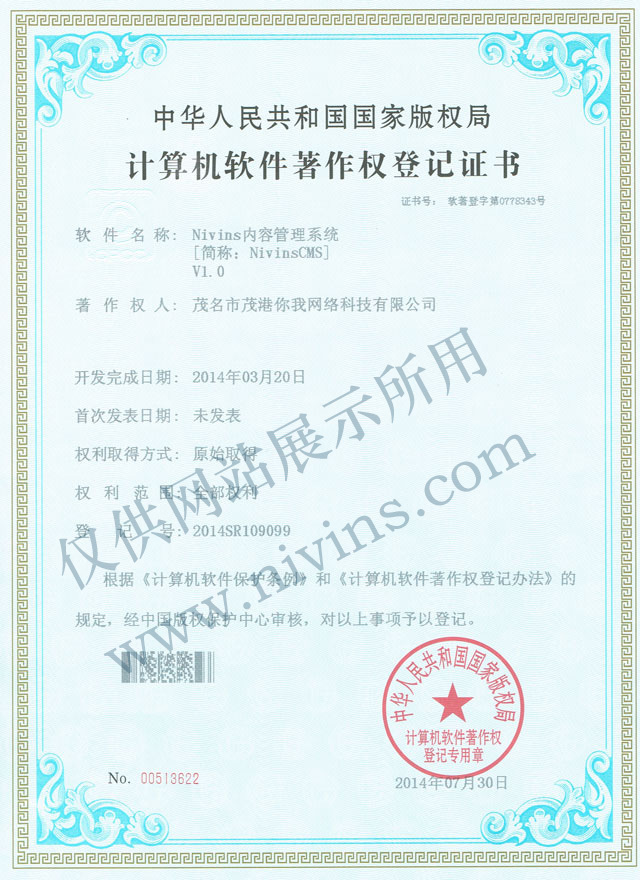 2014年7月30日,茂名市茂港你我網(wǎng)絡(luò)科技有限公司獲得了中華人民共和國國家版權(quán)局頒發(fā)的《計(jì)算機(jī)軟件著作權(quán)登記證書》,被認(rèn)定為軟件——“Nivins內(nèi)容管理系統(tǒng)V1.0”的法定著作權(quán)人,登記號(hào):2014SR109099,證書號(hào):軟著登字第0778343號(hào)。