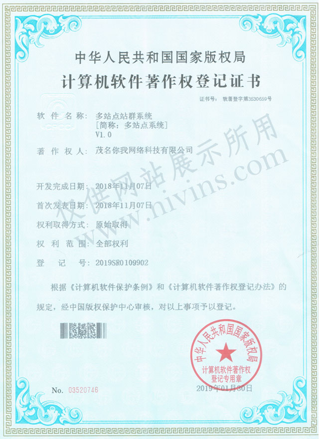 2019年1月30日,茂名你我網(wǎng)絡(luò)科技有限公司獲得了中華人民共和國國家版權(quán)局頒發(fā)的《計(jì)算機(jī)軟件著作權(quán)登記證書》,被認(rèn)定為軟件——“多站點(diǎn)站群系統(tǒng)V1.0”的法定著作權(quán)人,登記號(hào):2019SR0109902,證書號(hào):軟著登字第3530659號(hào)。