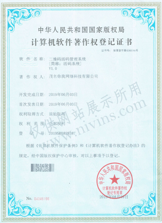 2019年8月9日,茂名你我網(wǎng)絡(luò)科技有限公司獲得了中華人民共和國國家版權(quán)局頒發(fā)的《計(jì)算機(jī)軟件著作權(quán)登記證書》,被認(rèn)定為軟件——“二維碼活碼管理系統(tǒng)V1.0”的法定著作權(quán)人,登記號(hào):2019SR0828387,證書號(hào):軟著登字第4249144號(hào)。