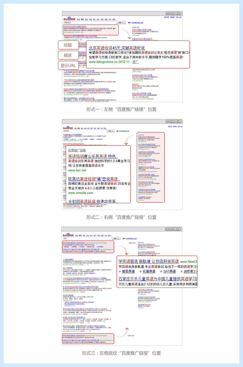 當企業(yè)推廣信息與網(wǎng)民需求高度吻合時,會在百度搜索結果頁以三種形式展現(xiàn)